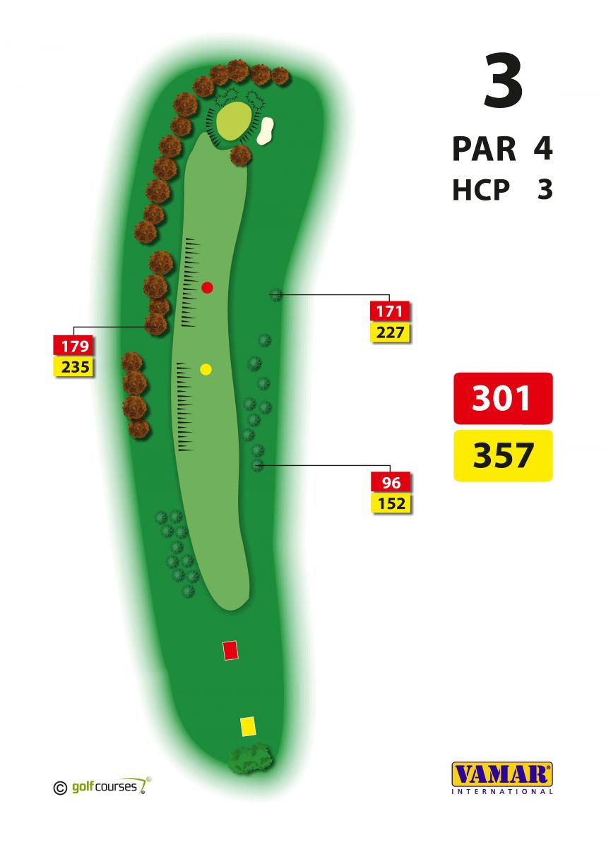Pro drive na třetí jamce ( par 4 ) je zde obrovský prostor. Mírně stoupající fervej není překážkou. Green u lesa je přístupný pro druhou ránu.