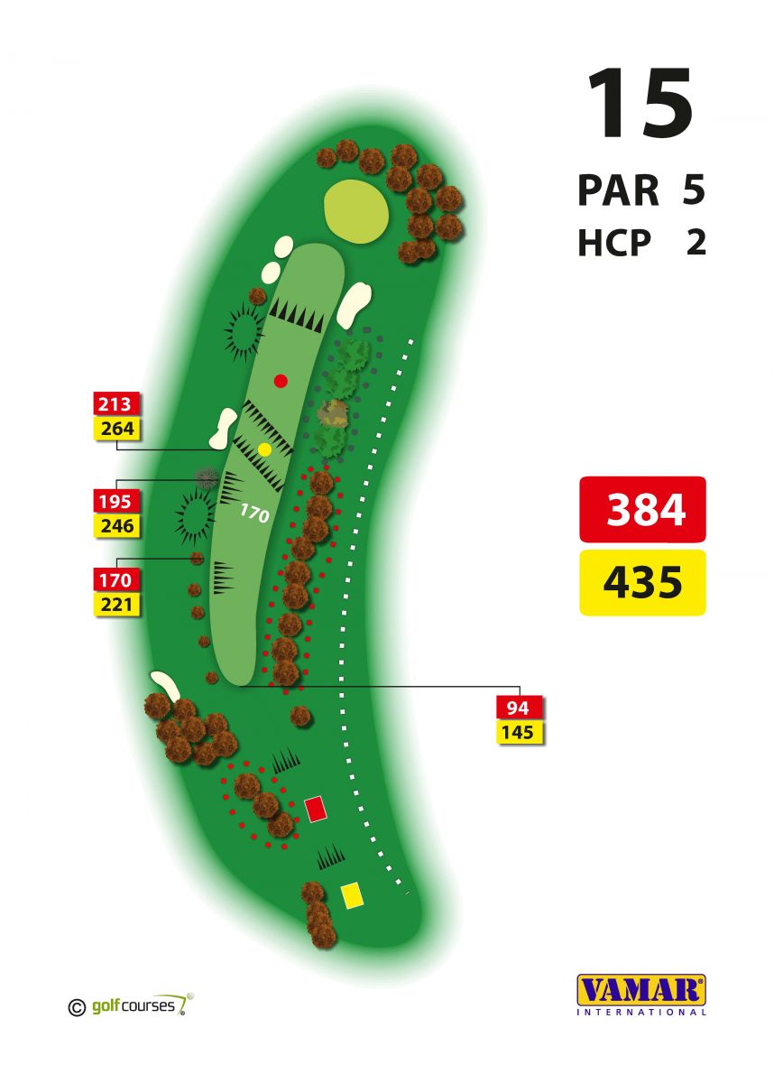 Patnáctou jamku ( par 5 ) s fervejí ze svahu lze využít k dlouhému odpalu přes zářez potoka. Pak lze druhou ránou atakovat green, za nímž je les.