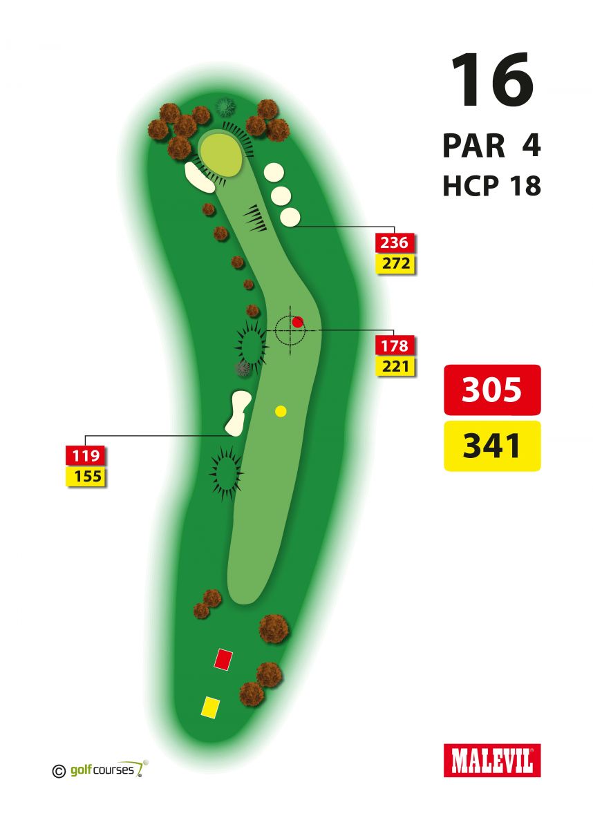 Na šestnácté jamce ( par 4 ) se hra vrátí podél šestnácté dráhy zpět nahoru na svah, ale dostatečný prostor kolem široké ferveje neskýtá žádné nebezpečí.