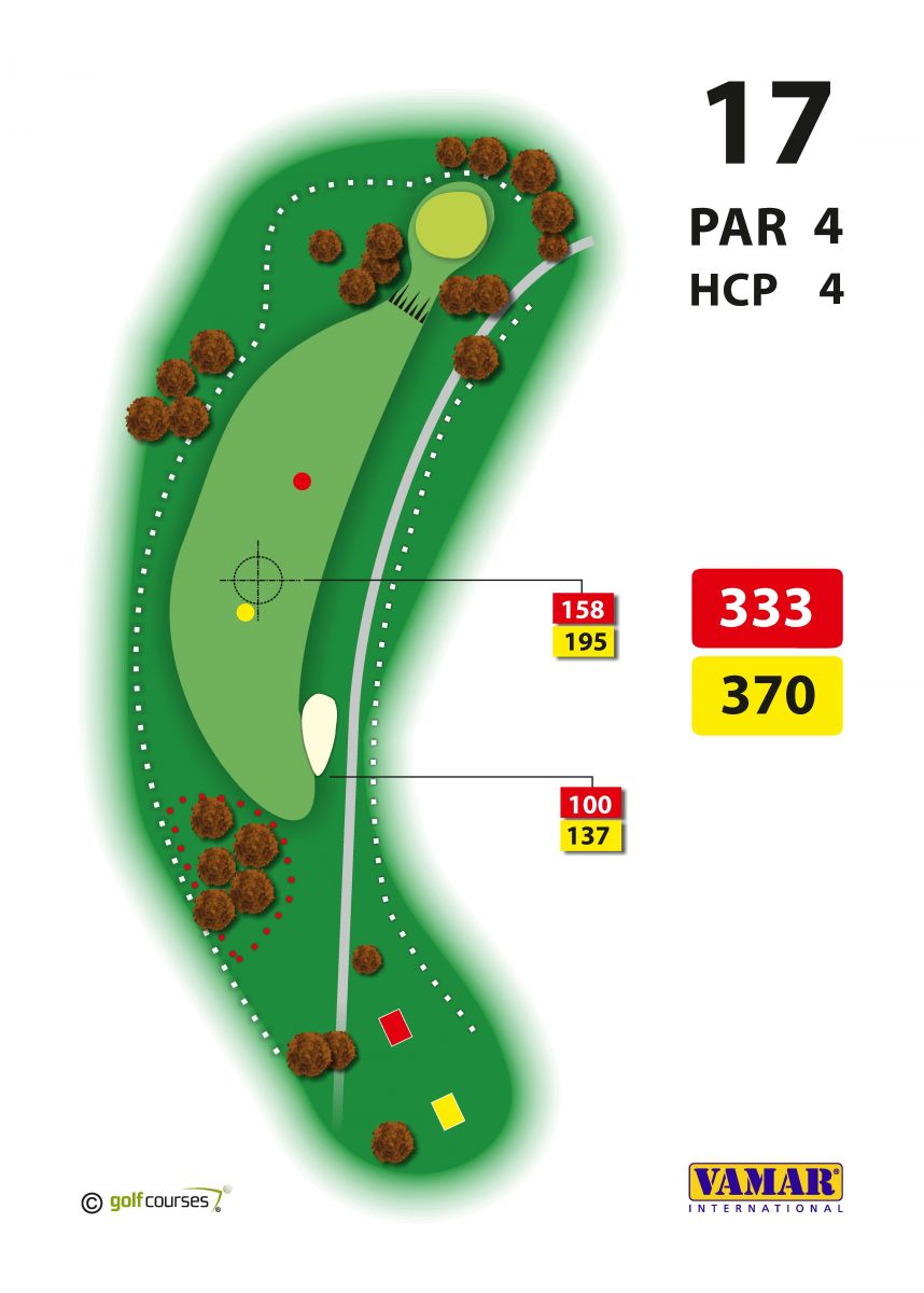 Sedmnáctá jamka ( par 4 ) jde znovu obráceně, opět dolů po svahu, druhá rána vyžaduje přesnost, protože green je sevřen vzrostlými stromy.