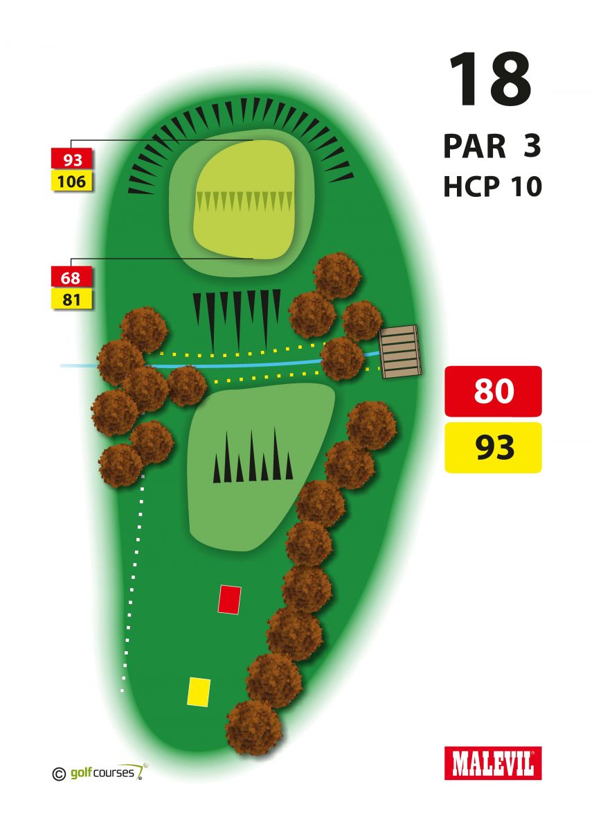 Z odpaliště osmnácté jamky ( par 3 ) musíte překonat příčný potok s vysokým protisvahem, na jehož vrchní hraně se rozkládá green.